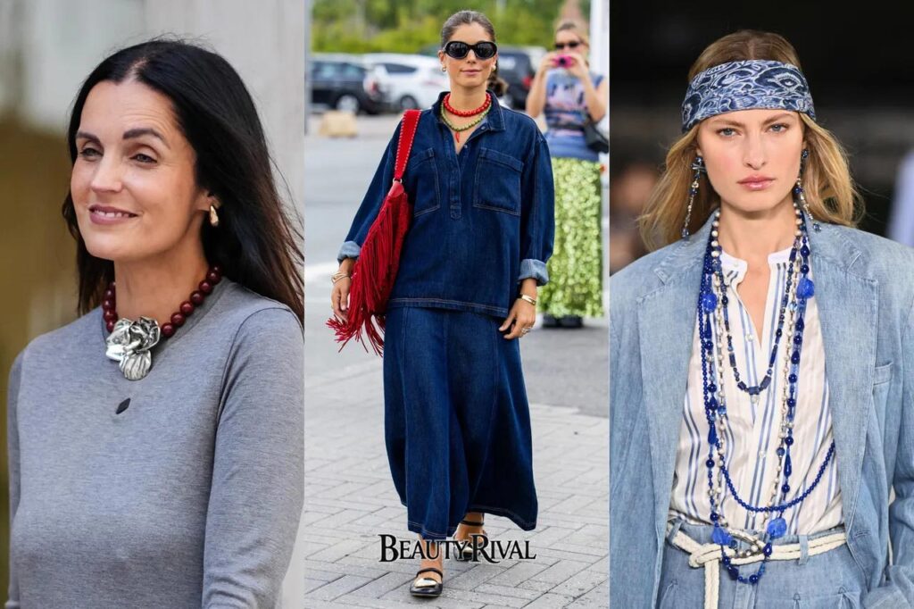 At Louis Vuitton and Zimmermann, designers embraced long, layered necklaces with charms and gemstones, reviving the boho-chic aesthetic. This look works for both casual and formal outfits.